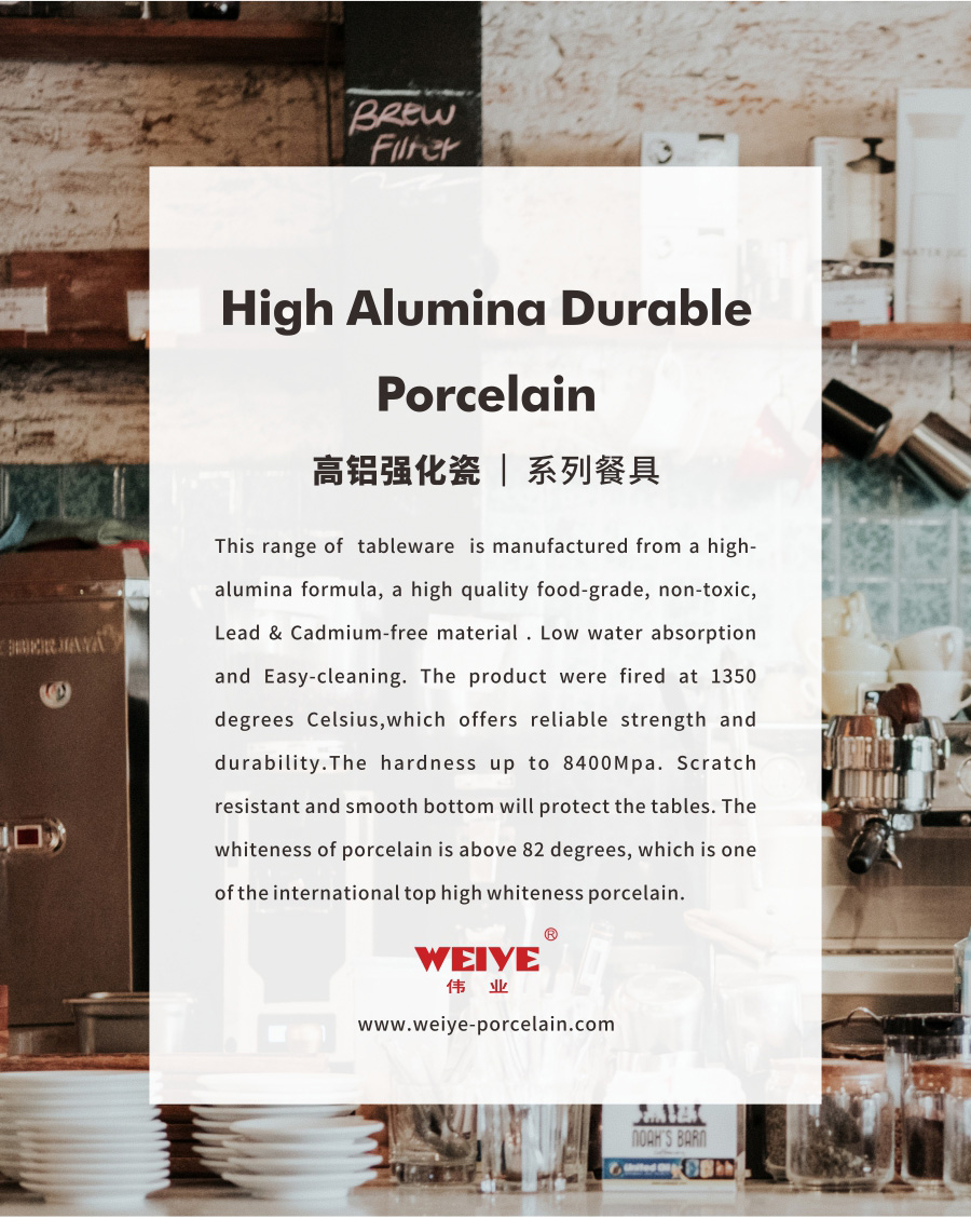This range of tableware is manufactured from a high-alumina formula, a high quality food-grade, non-toxic, Lead & Cadmium-free material . Low water absorption and Easy-cleaning. The product were fired at 1350 degrees Celsius,which offers reliable strength and durability.The hardness up to 8400Mpa. Scratch resistant and smooth bottom will protect the tables. The whiteness of porcelain is above 82 degrees, which is one of the international top high whiteness porcelain.
