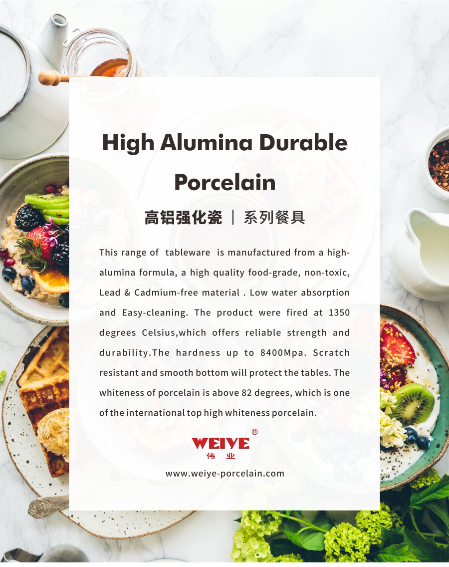 This range of tableware is manufactured from a high-alumina formula, a high quality food-grade, non-toxic, Lead & Cadmium-free material . Low water absorption and Easy-cleaning. The product were fired at 1350 degrees Celsius,which offers reliable strength and durability.The hardness up to 8400Mpa. Scratch resistant and smooth bottom will protect the tables. The whiteness of porcelain is above 82 degrees, which is one of the international top high whiteness porcelain.