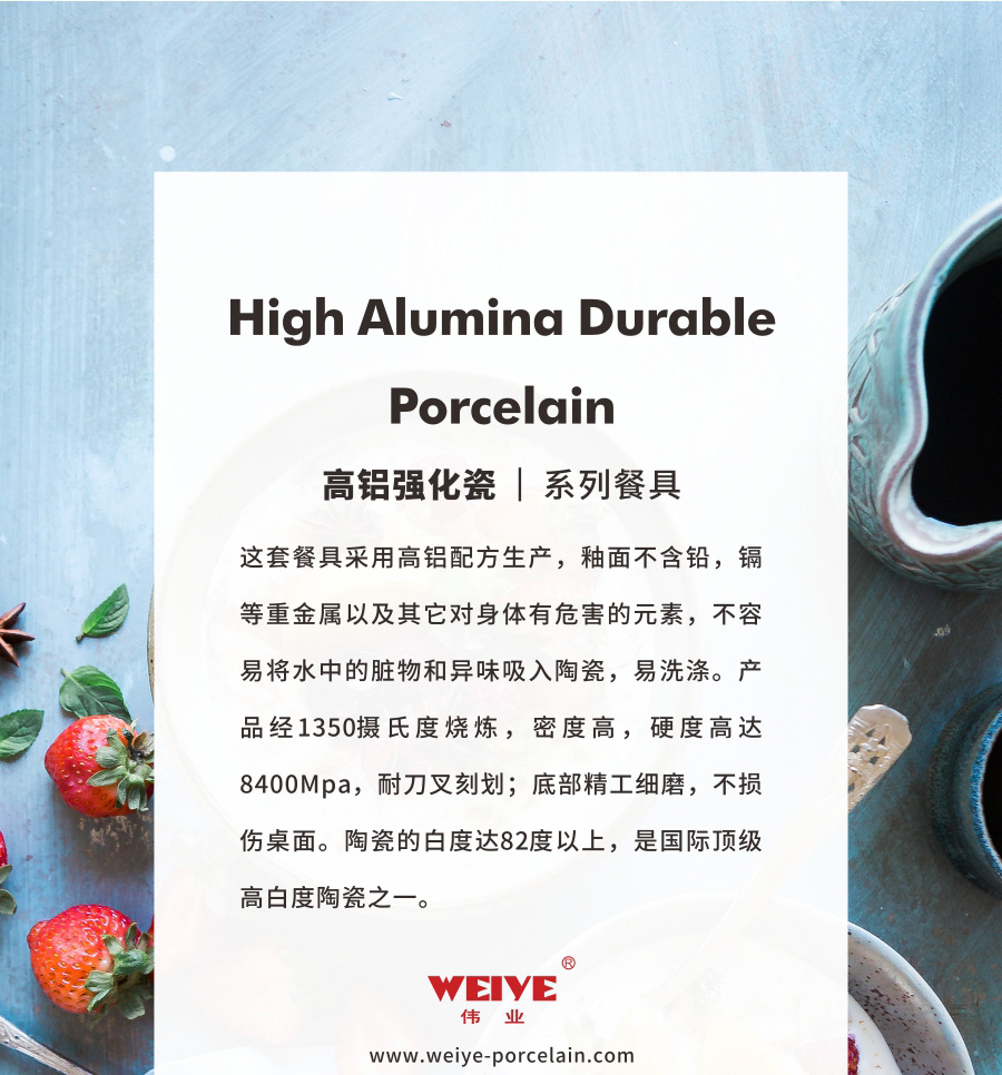 这套餐具采用高铝配方生产,釉面不含铅,镉等重金属以及其它对身体有危害的元素,不容易将水中的脏物和异味吸入陶瓷,易洗涤。产品经1350摄氏度烧炼,密度高,硬度高达8400Mpa,耐刀叉刻划;底部精工细磨,不损伤桌面。陶瓷的白度达82度以上,是国际顶级高白度陶瓷之一。