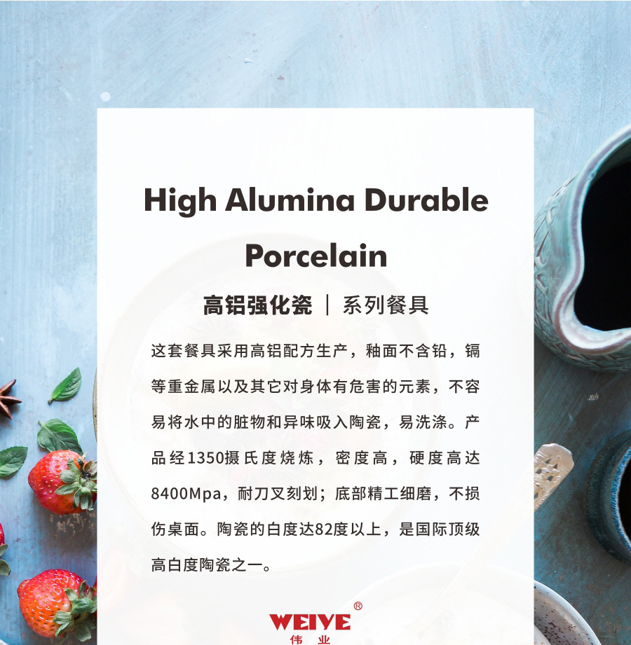 这套餐具采用高铝配方生产,釉面不含铅,镉等重金属以及其它对身体有危害的元素,不容易将水中的脏物和异味吸入陶瓷,易洗涤。产品经1350摄氏度烧炼,密度高,硬度高达8400Mpa,耐刀叉刻划;底部精工细磨,不损伤桌面。陶瓷的白度达82度以上,是国际顶级高白度陶瓷之一。