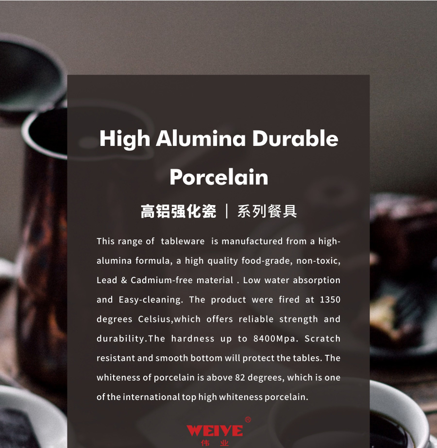 This range of tableware is manufactured from a high-alumina formula, a high quality food-grade, non-toxic, Lead & Cadmium-free material . Low water absorption and Easy-cleaning. The product were fired at 1350 degrees Celsius,which offers reliable strength and durability.The hardness up to 8400Mpa. Scratch resistant and smooth bottom will protect the tables. The whiteness of porcelain is above 82 degrees, which is one of the international top high whiteness porcelain.