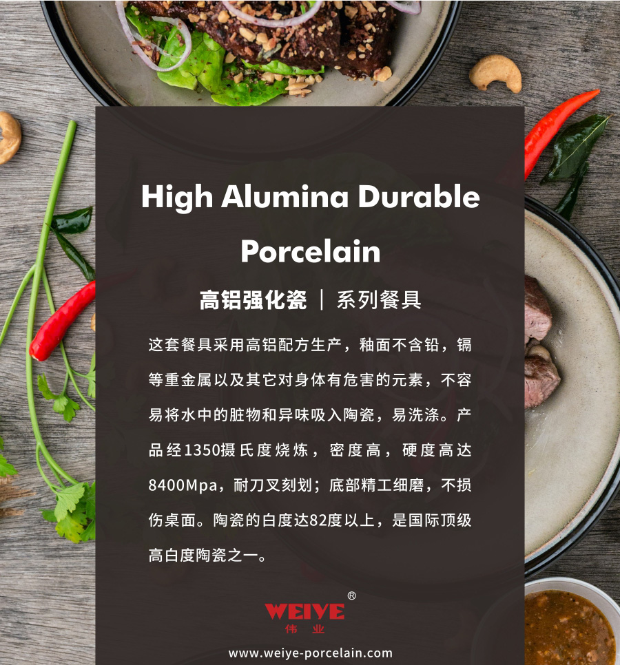 这套餐具采用高铝配方生产,釉面不含铅,镉等重金属以及其它对身体有危害的元素,不容易将水中的脏物和异味吸入陶瓷,易洗涤。产品经1350摄氏度烧炼,密度高,硬度高达8400Mpa,耐刀叉刻划;底部精工细磨,不损伤桌面。陶瓷的白度达82度以上,是国际顶级高白度陶瓷之一。