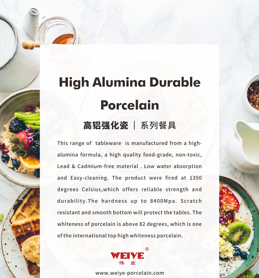 This range of tableware is manufactured from a high-alumina formula, a high quality food-grade, non-toxic, Lead & Cadmium-free material . Low water absorption and Easy-cleaning. The product were fired at 1350 degrees Celsius,which offers reliable strength and durability.The hardness up to 8400Mpa. Scratch resistant and smooth bottom will protect the tables. The whiteness of porcelain is above 82 degrees, which is one of the international top high whiteness porcelain.