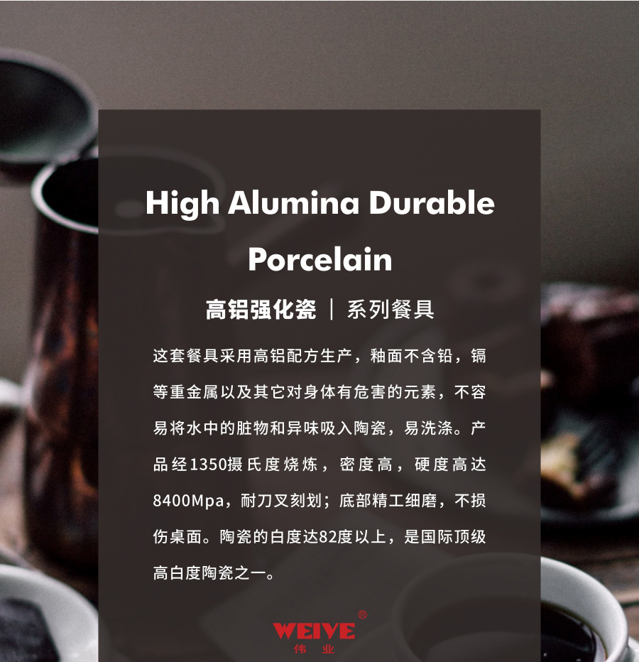 这套餐具采用高铝配方生产,釉面不含铅,镉等重金属以及其它对身体有危害的元素,不容易将水中的脏物和异味吸入陶瓷,易洗涤。产品经1350摄氏度烧炼,密度高,硬度高达8400Mpa,耐刀叉刻划;底部精工细磨,不损伤桌面。陶瓷的白度达82度以上,是国际顶级高白度陶瓷之一。