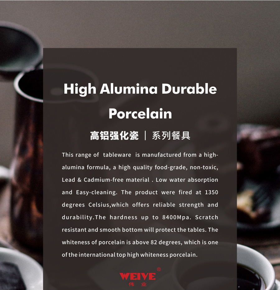 This range of tableware is manufactured from a high-alumina formula, a high quality food-grade, non-toxic, Lead & Cadmium-free material . Low water absorption and Easy-cleaning. The product were fired at 1350 degrees Celsius,which offers reliable strength and durability.The hardness up to 8400Mpa. Scratch resistant and smooth bottom will protect the tables. The whiteness of porcelain is above 82 degrees, which is one of the international top high whiteness porcelain.