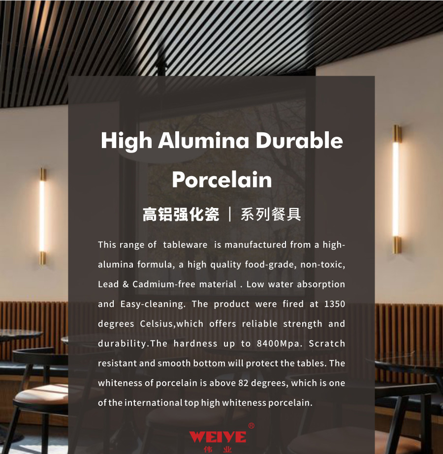 This range of tableware is manufactured from a high-alumina formula, a high quality food-grade, non-toxic, Lead & Cadmium-free material . Low water absorption and Easy-cleaning. The product were fired at 1350 degrees Celsius,which offers reliable strength and durability.The hardness up to 8400Mpa. Scratch resistant and smooth bottom will protect the tables. The whiteness of porcelain is above 82 degrees, which is one of the international top high whiteness porcelain.