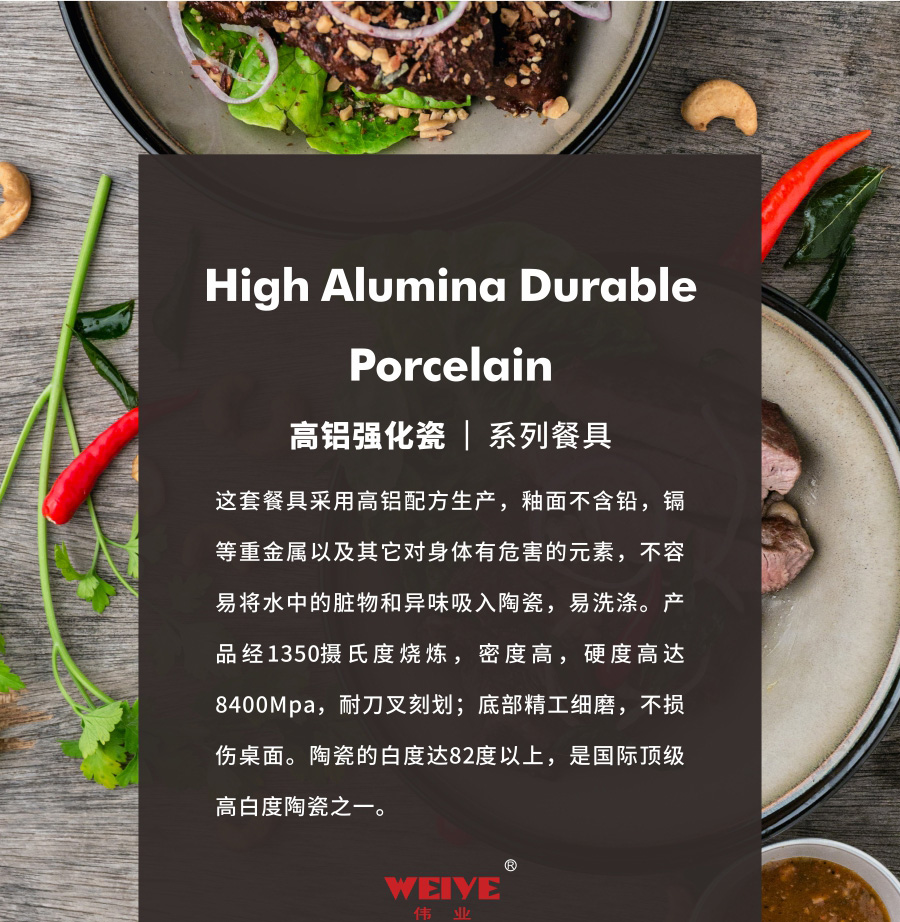 这套餐具采用高铝配方生产,釉面不含铅,镉等重金属以及其它对身体有危害的元素,不容易将水中的脏物和异味吸入陶瓷,易洗涤。产品经1350摄氏度烧炼,密度高,硬度高达8400Mpa,耐刀叉刻划;底部精工细磨,不损伤桌面。陶瓷的白度达82度以上,是国际顶级高白度陶瓷之一。