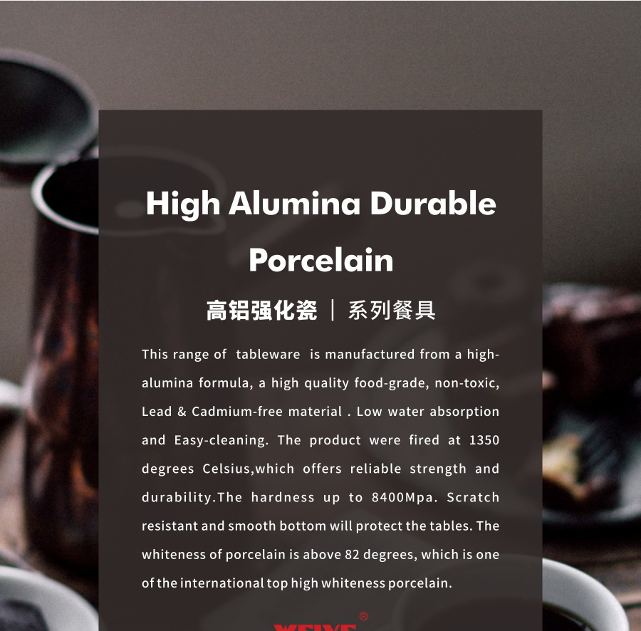 This range of tableware is manufactured from a high-alumina formula, a high quality food-grade, non-toxic, Lead & Cadmium-free material . Low water absorption and Easy-cleaning. The product were fired at 1350 degrees Celsius,which offers reliable strength and durability.The hardness up to 8400Mpa. Scratch resistant and smooth bottom will protect the tables. The whiteness of porcelain is above 82 degrees, which is one of the international top high whiteness porcelain.