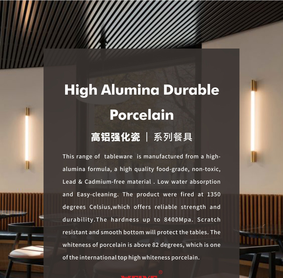 This range of tableware is manufactured from a high-alumina formula, a high quality food-grade, non-toxic, Lead & Cadmium-free material . Low water absorption and Easy-cleaning. The product were fired at 1350 degrees Celsius,which offers reliable strength and durability.The hardness up to 8400Mpa. Scratch resistant and smooth bottom will protect the tables. The whiteness of porcelain is above 82 degrees, which is one of the international top high whiteness porcelain.