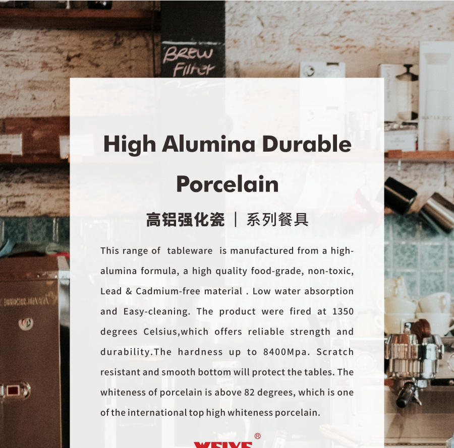 This range of tableware is manufactured from a high-alumina formula, a high quality food-grade, non-toxic, Lead & Cadmium-free material . Low water absorption and Easy-cleaning. The product were fired at 1350 degrees Celsius,which offers reliable strength and durability.The hardness up to 8400Mpa. Scratch resistant and smooth bottom will protect the tables. The whiteness of porcelain is above 82 degrees, which is one of the international top high whiteness porcelain.