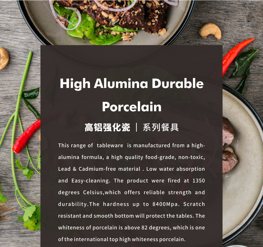 This range of tableware is manufactured from a high-alumina formula, a high quality food-grade, non-toxic, Lead & Cadmium-free material . Low water absorption and Easy-cleaning. The product were fired at 1350 degrees Celsius,which offers reliable strength and durability.The hardness up to 8400Mpa. Scratch resistant and smooth bottom will protect the tables. The whiteness of porcelain is above 82 degrees, which is one of the international top high whiteness porcelain.