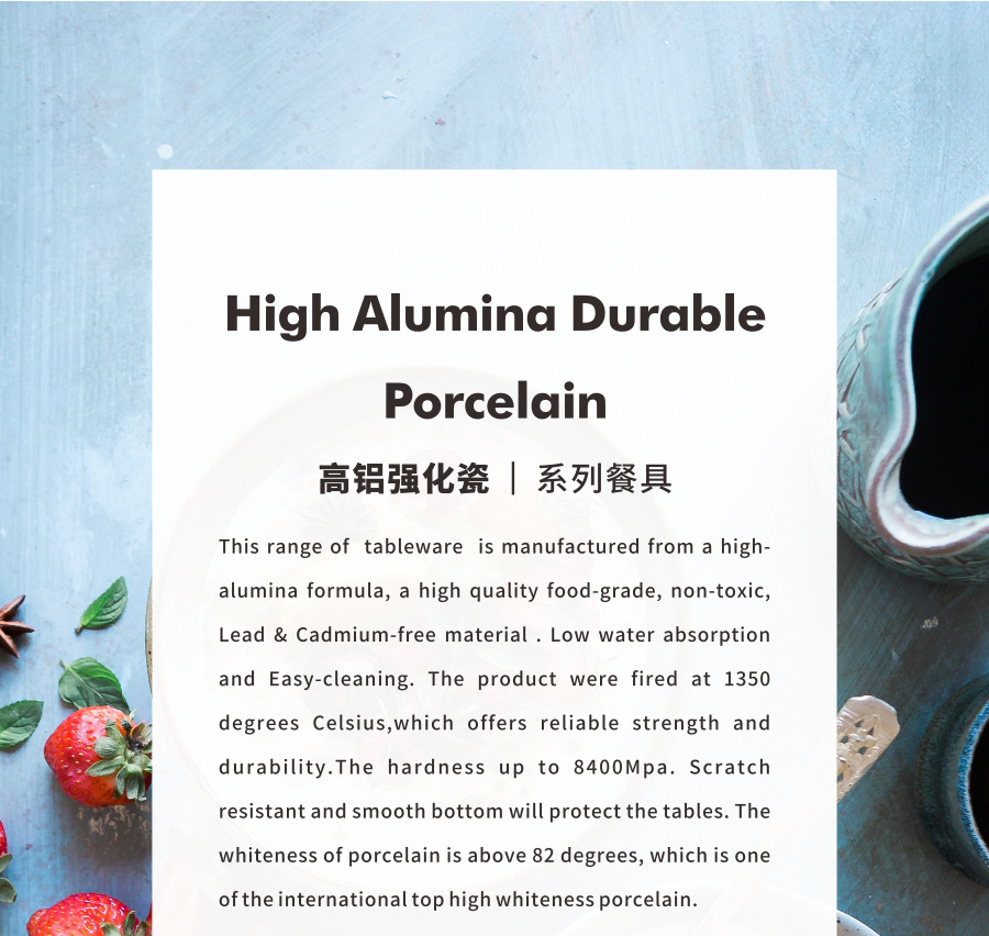This range of tableware is manufactured from a high-alumina formula, a high quality food-grade, non-toxic, Lead & Cadmium-free material . Low water absorption and Easy-cleaning. The product were fired at 1350 degrees Celsius,which offers reliable strength and durability.The hardness up to 8400Mpa. Scratch resistant and smooth bottom will protect the tables. The whiteness of porcelain is above 82 degrees, which is one of the international top high whiteness porcelain.
