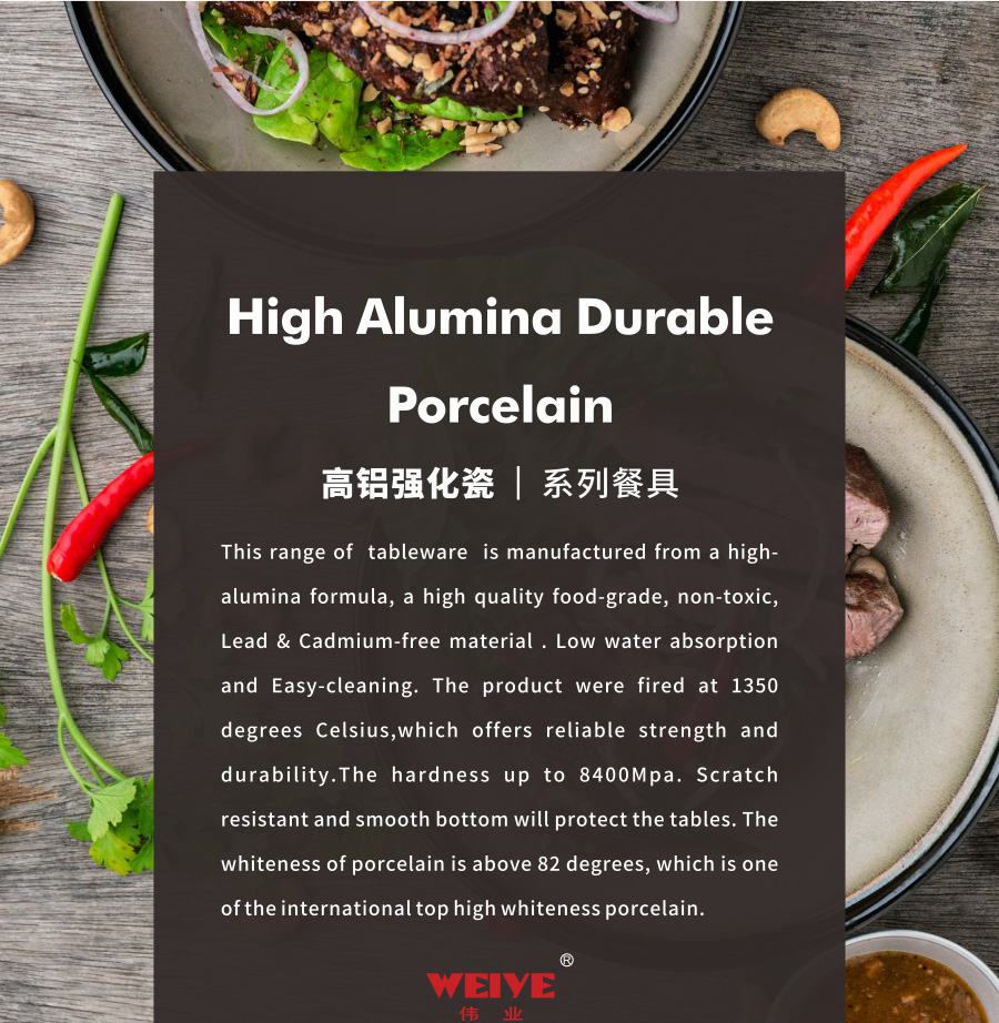 This range of tableware is manufactured from a high-alumina formula, a high quality food-grade, non-toxic, Lead & Cadmium-free material . Low water absorption and Easy-cleaning. The product were fired at 1350 degrees Celsius,which offers reliable strength and durability.The hardness up to 8400Mpa. Scratch resistant and smooth bottom will protect the tables. The whiteness of porcelain is above 82 degrees, which is one of the international top high whiteness porcelain.