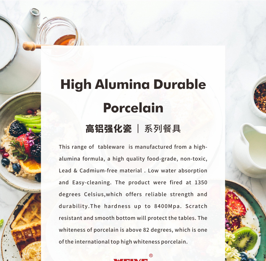 This range of tableware is manufactured from a high-alumina formula, a high quality food-grade, non-toxic, Lead & Cadmium-free material . Low water absorption and Easy-cleaning. The product were fired at 1350 degrees Celsius,which offers reliable strength and durability.The hardness up to 8400Mpa. Scratch resistant and smooth bottom will protect the tables. The whiteness of porcelain is above 82 degrees, which is one of the international top high whiteness porcelain.