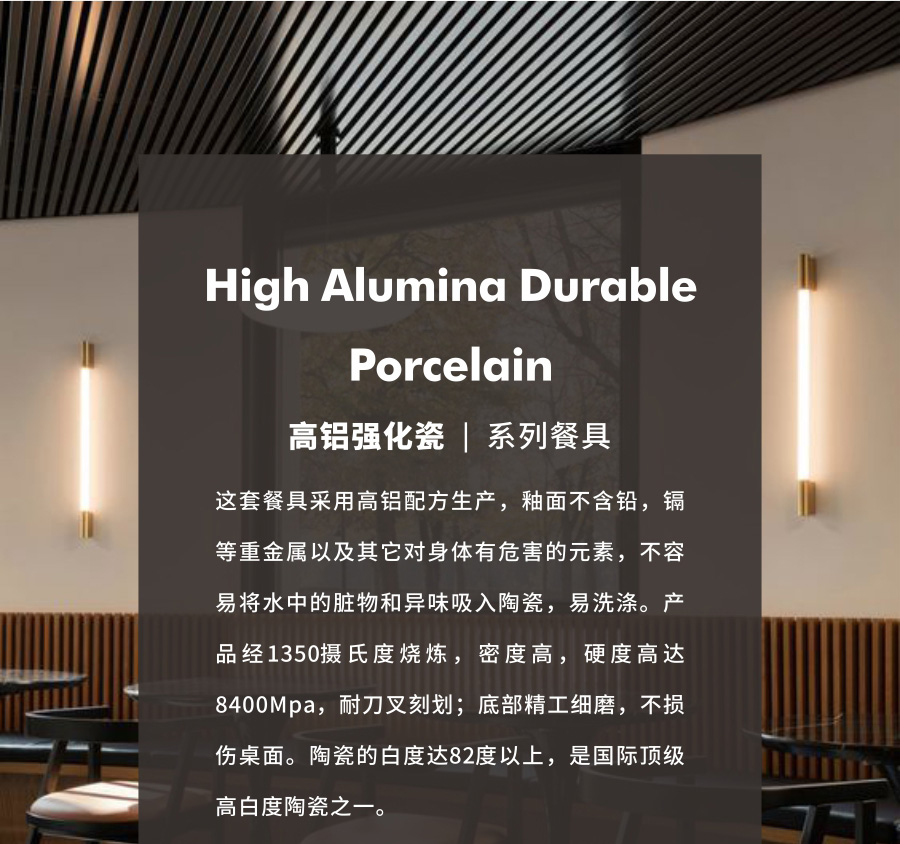 这套餐具采用高铝配方生产,釉面不含铅,镉等重金属以及其它对身体有危害的元素,不容易将水中的脏物和异味吸入陶瓷,易洗涤。产品经1350摄氏度烧炼,密度高,硬度高达8400Mpa,耐刀叉刻划;底部精工细磨,不损伤桌面。陶瓷的白度达82度以上,是国际顶级高白度陶瓷之一。
