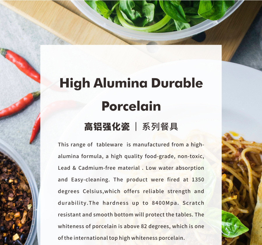 This range of tableware is manufactured from a high-alumina formula, a high quality food-grade, non-toxic, Lead & Cadmium-free material . Low water absorption and Easy-cleaning. The product were fired at 1350 degrees Celsius,which offers reliable strength and durability.The hardness up to 8400Mpa. Scratch resistant and smooth bottom will protect the tables. The whiteness of porcelain is above 82 degrees, which is one of the international top high whiteness porcelain.