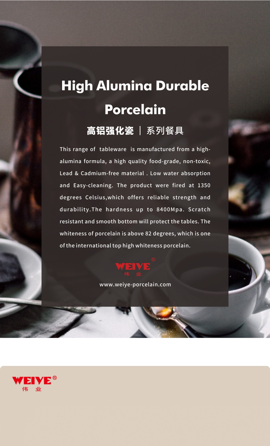 This range of tableware is manufactured from a high-alumina formula, a high quality food-grade, non-toxic, Lead & Cadmium-free material . Low water absorption and Easy-cleaning. The product were fired at 1350 degrees Celsius,which offers reliable strength and durability.The hardness up to 8400Mpa. Scratch resistant and smooth bottom will protect the tables. The whiteness of porcelain is above 82 degrees, which is one of the international top high whiteness porcelain.