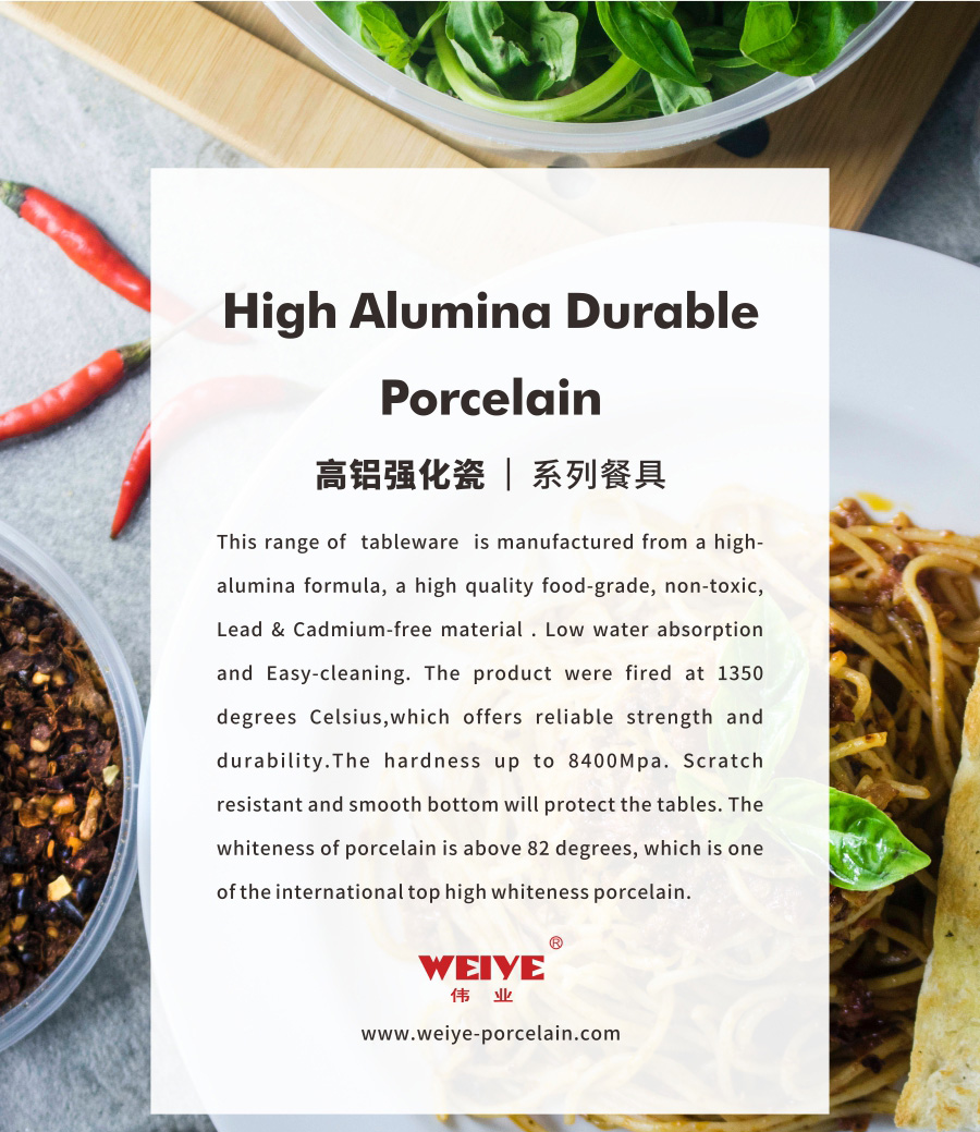 This range of tableware is manufactured from a high-alumina formula, a high quality food-grade, non-toxic, Lead & Cadmium-free material . Low water absorption and Easy-cleaning. The product were fired at 1350 degrees Celsius,which offers reliable strength and durability.The hardness up to 8400Mpa. Scratch resistant and smooth bottom will protect the tables. The whiteness of porcelain is above 82 degrees, which is one of the international top high whiteness porcelain.
