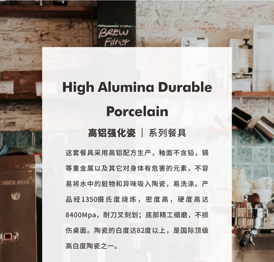 这套餐具采用高铝配方生产,釉面不含铅,镉等重金属以及其它对身体有危害的元素,不容易将水中的脏物和异味吸入陶瓷,易洗涤。产品经1350摄氏度烧炼,密度高,硬度高达8400Mpa,耐刀叉刻划;底部精工细磨,不损伤桌面。陶瓷的白度达82度以上,是国际顶级高白度陶瓷之一。