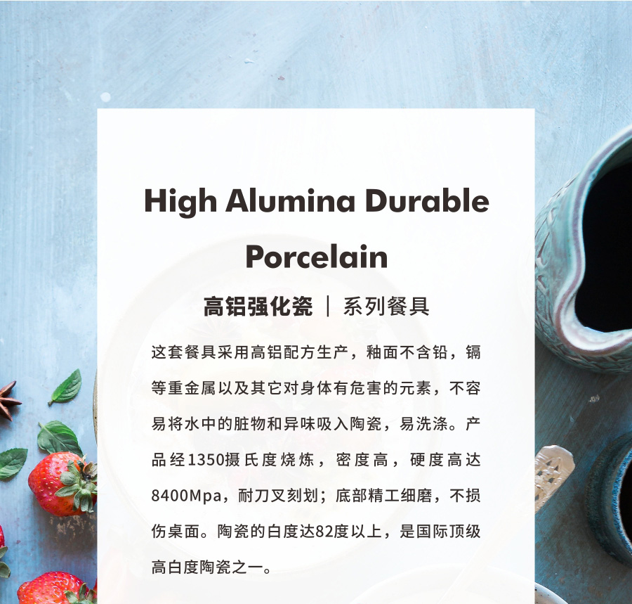 这套餐具采用高铝配方生产,釉面不含铅,镉等重金属以及其它对身体有危害的元素,不容易将水中的脏物和异味吸入陶瓷,易洗涤。产品经1350摄氏度烧炼,密度高,硬度高达8400Mpa,耐刀叉刻划;底部精工细磨,不损伤桌面。陶瓷的白度达82度以上,是国际顶级高白度陶瓷之一。