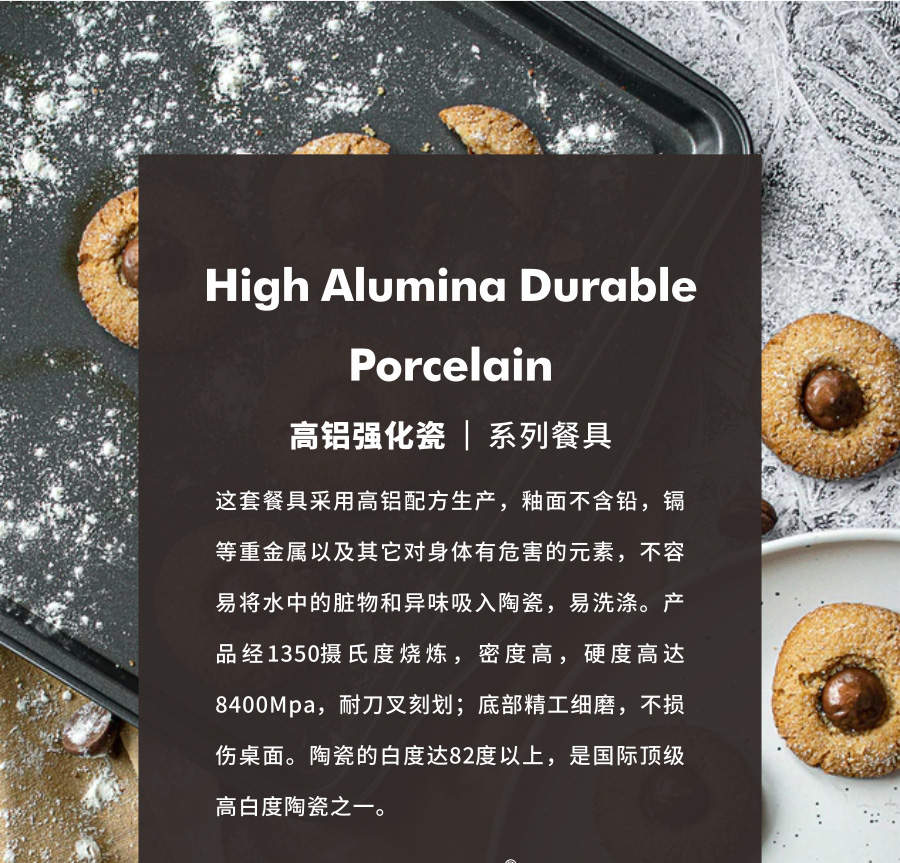 这套餐具采用高铝配方生产,釉面不含铅,镉等重金属以及其它对身体有危害的元素,不容易将水中的脏物和异味吸入陶瓷,易洗涤。产品经1350摄氏度烧炼,密度高,硬度高达8400Mpa,耐刀叉刻划;底部精工细磨,不损伤桌面。陶瓷的白度达82度以上,是国际顶级高白度陶瓷之一。