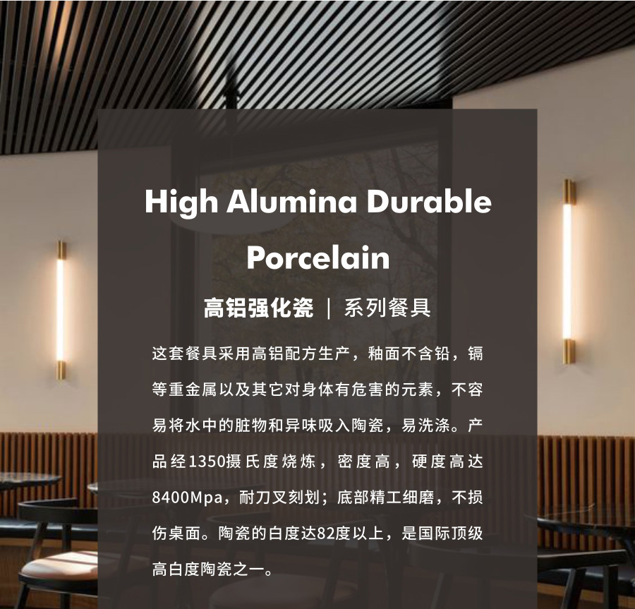 这套餐具采用高铝配方生产,釉面不含铅,镉等重金属以及其它对身体有危害的元素,不容易将水中的脏物和异味吸入陶瓷,易洗涤。产品经1350摄氏度烧炼,密度高,硬度高达8400Mpa,耐刀叉刻划;底部精工细磨,不损伤桌面。陶瓷的白度达82度以上,是国际顶级高白度陶瓷之一。