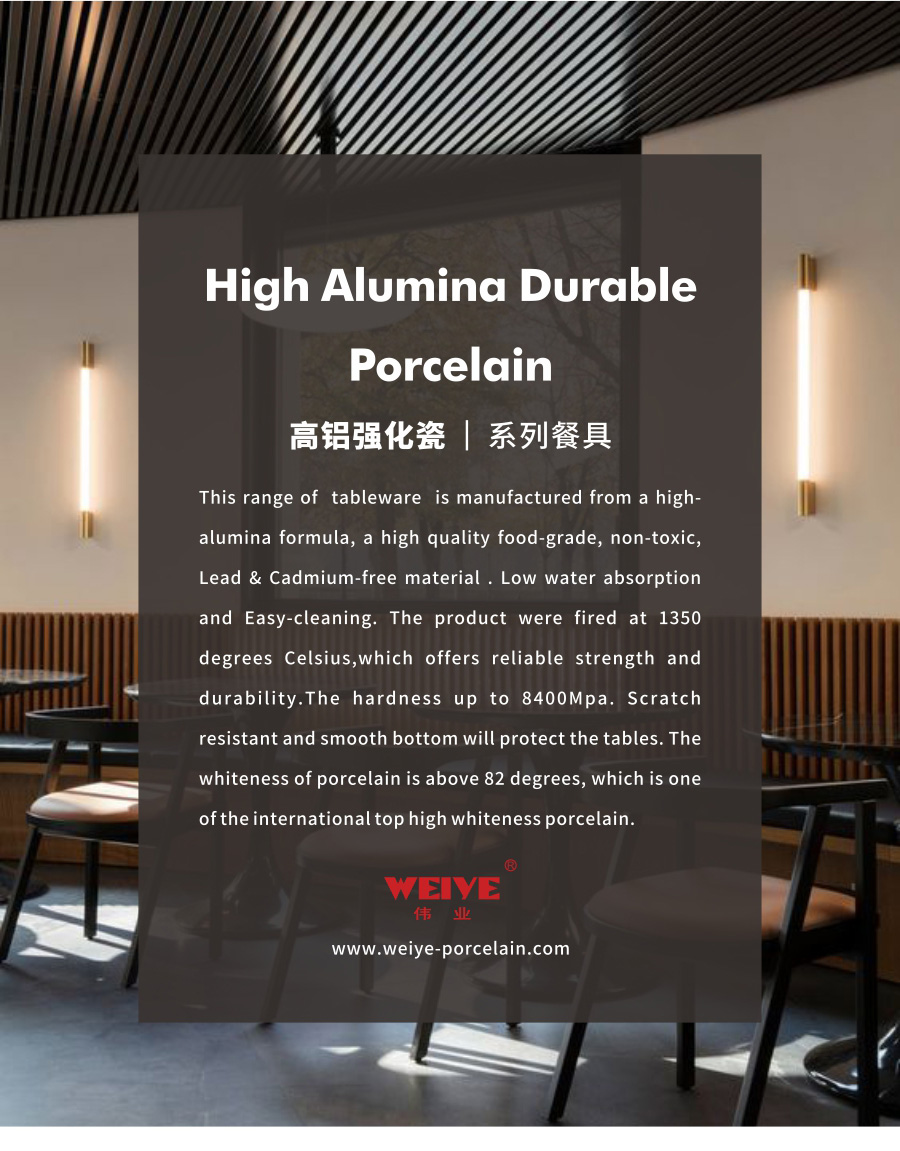 This range of tableware is manufactured from a high-alumina formula, a high quality food-grade, non-toxic, Lead & Cadmium-free material . Low water absorption and Easy-cleaning. The product were fired at 1350 degrees Celsius,which offers reliable strength and durability.The hardness up to 8400Mpa. Scratch resistant and smooth bottom will protect the tables. The whiteness of porcelain is above 82 degrees, which is one of the international top high whiteness porcelain.