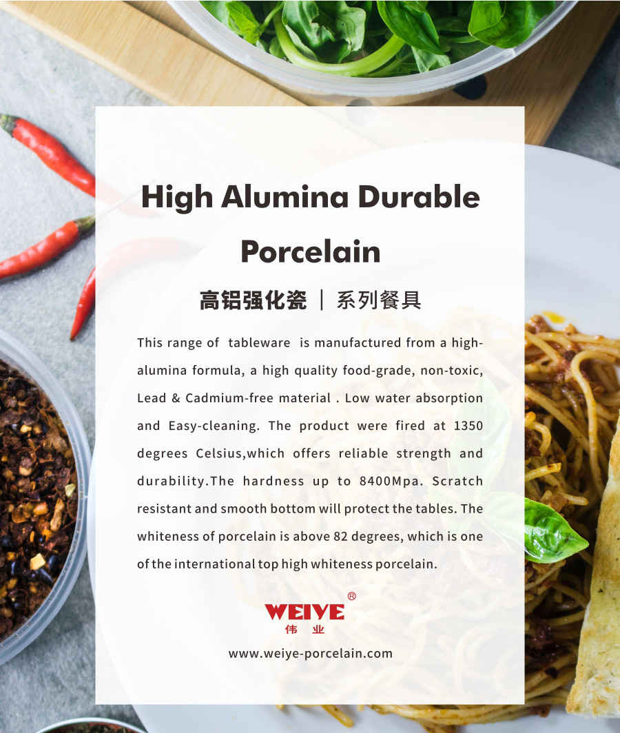 This range of tableware is manufactured from a high-alumina formula, a high quality food-grade, non-toxic, Lead & Cadmium-free material . Low water absorption and Easy-cleaning. The product were fired at 1350 degrees Celsius,which offers reliable strength and durability.The hardness up to 8400Mpa. Scratch resistant and smooth bottom will protect the tables. The whiteness of porcelain is above 82 degrees, which is one of the international top high whiteness porcelain.