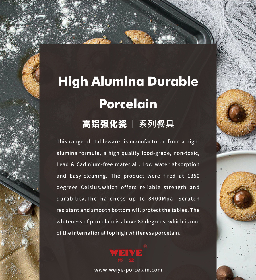 This range of tableware is manufactured from a high-alumina formula, a high quality food-grade, non-toxic, Lead & Cadmium-free material . Low water absorption and Easy-cleaning. The product were fired at 1350 degrees Celsius,which offers reliable strength and durability.The hardness up to 8400Mpa. Scratch resistant and smooth bottom will protect the tables. The whiteness of porcelain is above 82 degrees, which is one of the international top high whiteness porcelain.