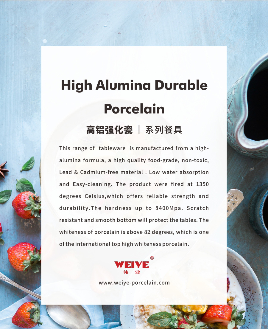 This range of tableware is manufactured from a high-alumina formula, a high quality food-grade, non-toxic, Lead & Cadmium-free material . Low water absorption and Easy-cleaning. The product were fired at 1350 degrees Celsius,which offers reliable strength and durability.The hardness up to 8400Mpa. Scratch resistant and smooth bottom will protect the tables. The whiteness of porcelain is above 82 degrees, which is one of the international top high whiteness porcelain.