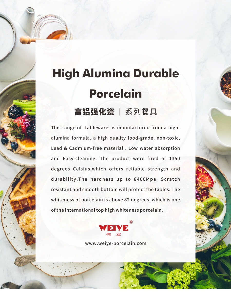 This range of tableware is manufactured from a high-alumina formula, a high quality food-grade, non-toxic, Lead & Cadmium-free material . Low water absorption and Easy-cleaning. The product were fired at 1350 degrees Celsius,which offers reliable strength and durability.The hardness up to 8400Mpa. Scratch resistant and smooth bottom will protect the tables. The whiteness of porcelain is above 82 degrees, which is one of the international top high whiteness porcelain.