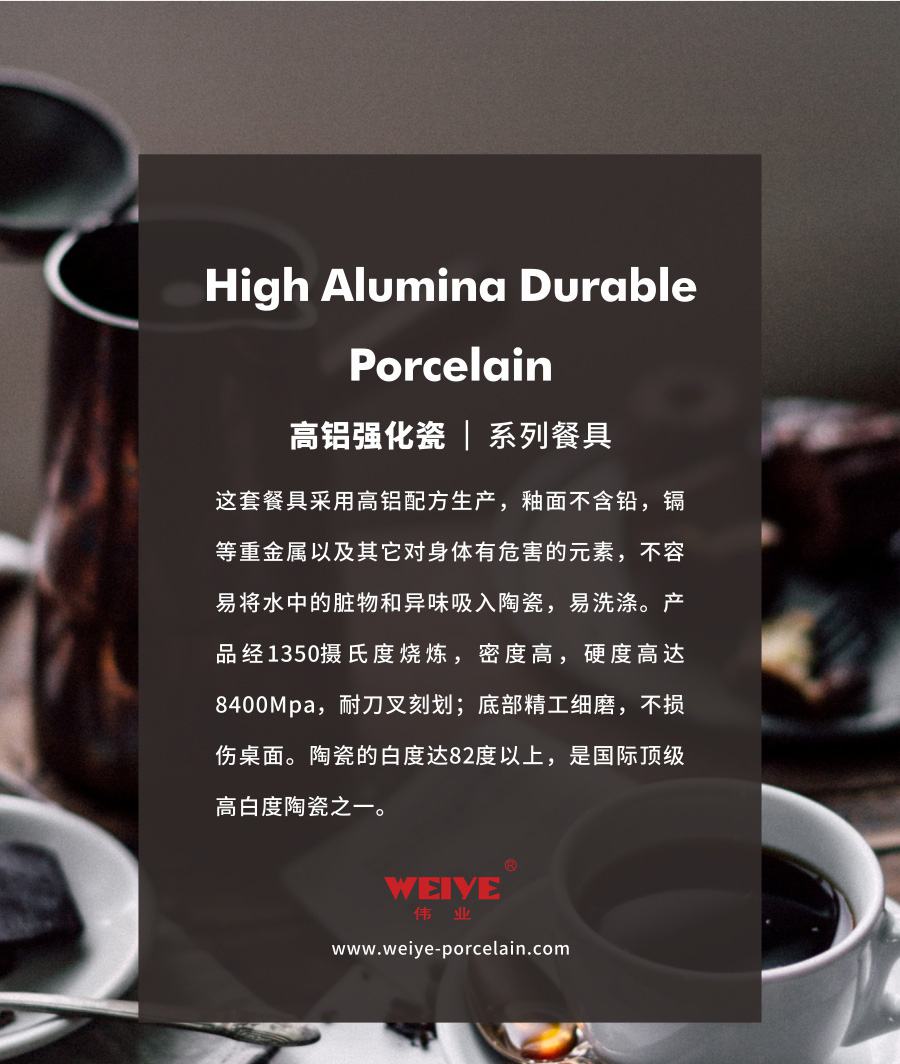 这套餐具采用高铝配方生产,釉面不含铅,镉等重金属以及其它对身体有危害的元素,不容易将水中的脏物和异味吸入陶瓷,易洗涤。产品经1350摄氏度烧炼,密度高,硬度高达8400Mpa,耐刀叉刻划;底部精工细磨,不损伤桌面。陶瓷的白度达82度以上,是国际顶级高白度陶瓷之一。