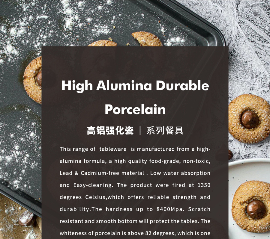 This range of tableware is manufactured from a high-alumina formula, a high quality food-grade, non-toxic, Lead & Cadmium-free material . Low water absorption and Easy-cleaning. The product were fired at 1350 degrees Celsius,which offers reliable strength and durability.The hardness up to 8400Mpa. Scratch resistant and smooth bottom will protect the tables. The whiteness of porcelain is above 82 degrees, which is one of the international top high whiteness porcelain.