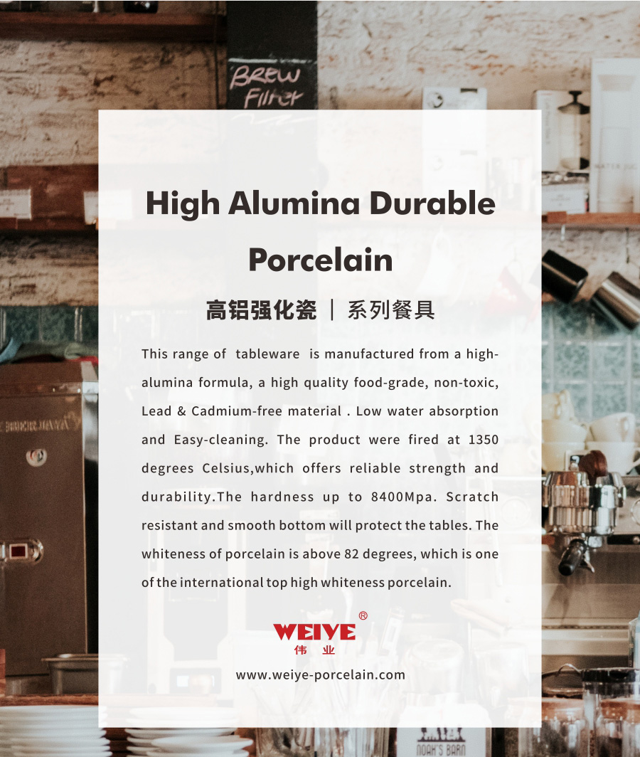 This range of tableware is manufactured from a high-alumina formula, a high quality food-grade, non-toxic, Lead & Cadmium-free material . Low water absorption and Easy-cleaning. The product were fired at 1350 degrees Celsius,which offers reliable strength and durability.The hardness up to 8400Mpa. Scratch resistant and smooth bottom will protect the tables. The whiteness of porcelain is above 82 degrees, which is one of the international top high whiteness porcelain.