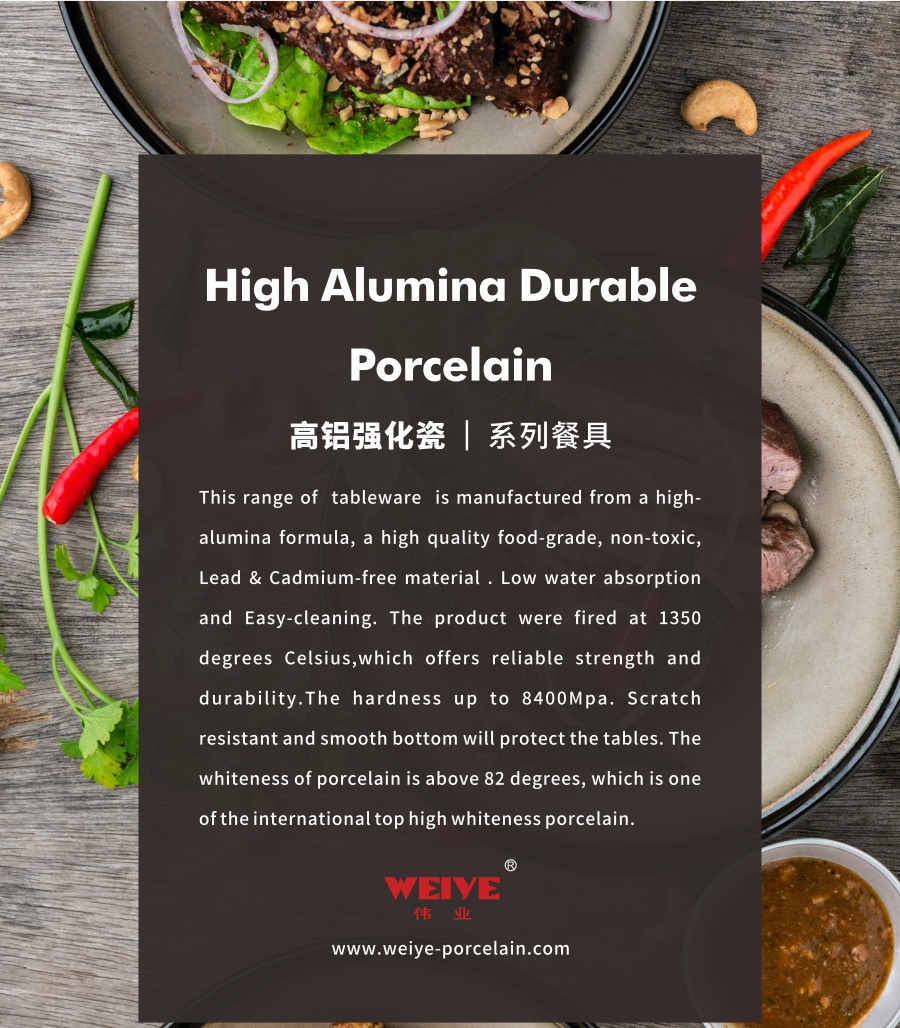 This range of tableware is manufactured from a high-alumina formula, a high quality food-grade, non-toxic, Lead & Cadmium-free material . Low water absorption and Easy-cleaning. The product were fired at 1350 degrees Celsius,which offers reliable strength and durability.The hardness up to 8400Mpa. Scratch resistant and smooth bottom will protect the tables. The whiteness of porcelain is above 82 degrees, which is one of the international top high whiteness porcelain.