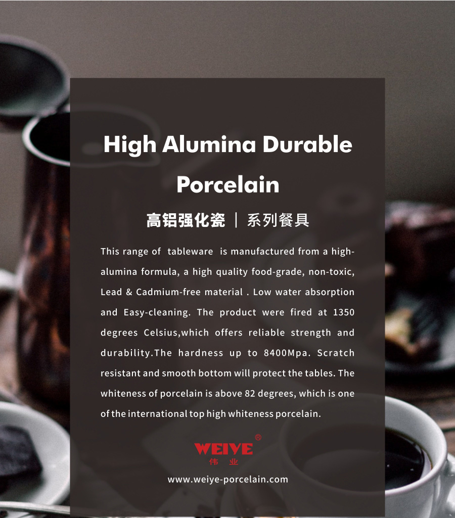 This range of  tableware  is manufactured from a high-alumina formula, a high quality food-grade, non-toxic, Lead & Cadmium-free material . Low water absorption and Easy-cleaning. The product were fired at 1350 degrees Celsius,which offers reliable strength and durability.The hardness up to 8400Mpa. Scratch resistant and smooth bottom will protect the tables. The whiteness of porcelain is above 82 degrees, which is one of the international top high whiteness porcelain.