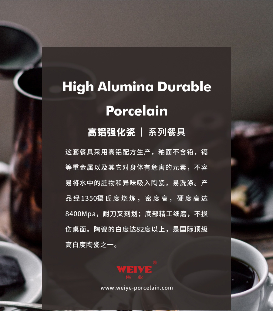 这套餐具采用高铝配方生产,釉面不含铅,镉等重金属以及其它对身体有危害的元素,不容易将水中的脏物和异味吸入陶瓷,易洗涤。产品经1350摄氏度烧炼,密度高,硬度高达8400Mpa,耐刀叉刻划;底部精工细磨,不损伤桌面。陶瓷的白度达82度以上,是国际顶级高白度陶瓷之一。