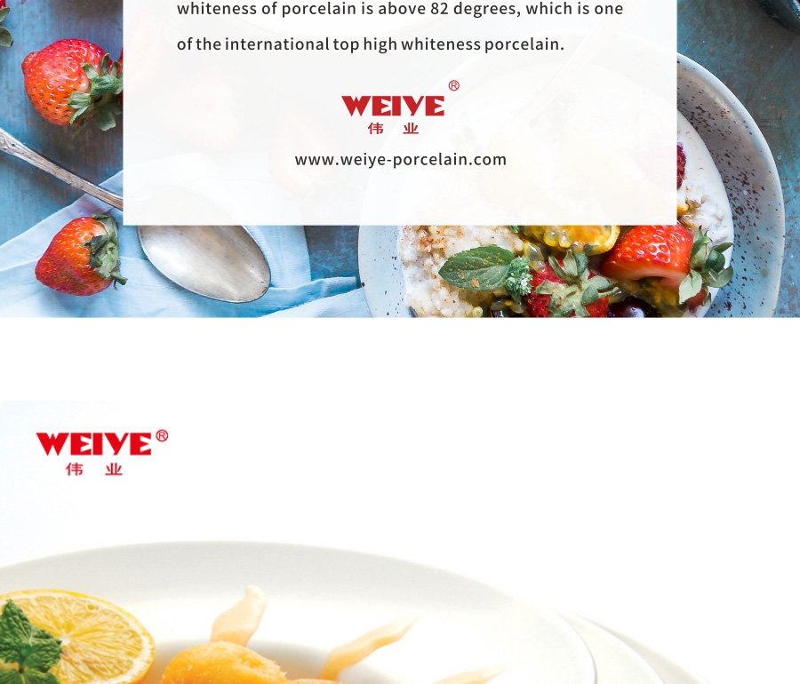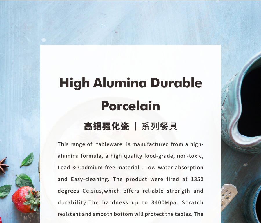 This range of tableware is manufactured from a high-alumina formula, a high quality food-grade, non-toxic, Lead & Cadmium-free material . Low water absorption and Easy-cleaning. The product were fired at 1350 degrees Celsius,which offers reliable strength and durability.The hardness up to 8400Mpa. Scratch resistant and smooth bottom will protect the tables. The whiteness of porcelain is above 82 degrees, which is one of the international top high whiteness porcelain.