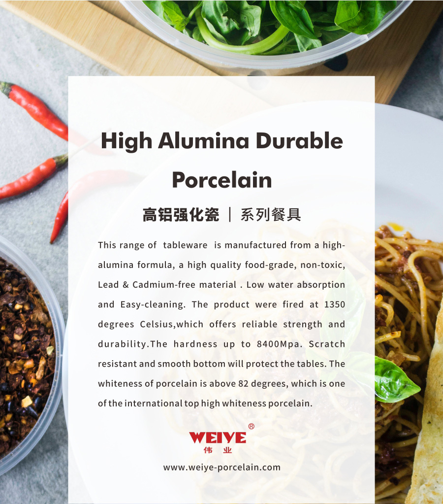 This range of tableware is manufactured from a high-alumina formula, a high quality food-grade, non-toxic, Lead & Cadmium-free material . Low water absorption and Easy-cleaning. The product were fired at 1350 degrees Celsius,which offers reliable strength and durability.The hardness up to 8400Mpa. Scratch resistant and smooth bottom will protect the tables. The whiteness of porcelain is above 82 degrees, which is one of the international top high whiteness porcelain.