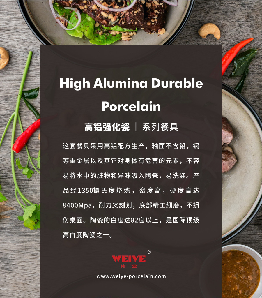 这套餐具采用高铝配方生产,釉面不含铅,镉等重金属以及其它对身体有危害的元素,不容易将水中的脏物和异味吸入陶瓷,易洗涤。产品经1350摄氏度烧炼,密度高,硬度高达8400Mpa,耐刀叉刻划;底部精工细磨,不损伤桌面。陶瓷的白度达82度以上,是国际顶级高白度陶瓷之一。
