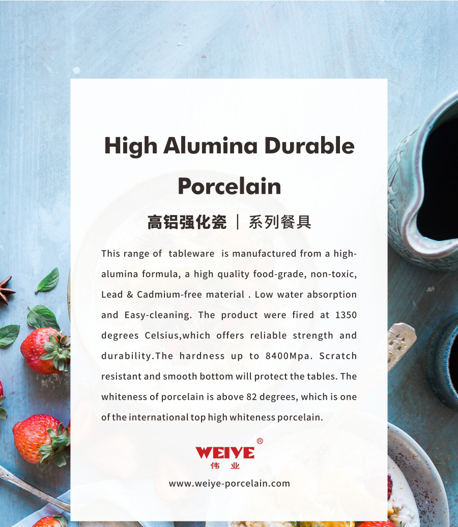 This range of tableware is manufactured from a high-alumina formula, a high quality food-grade, non-toxic, Lead & Cadmium-free material . Low water absorption and Easy-cleaning. The product were fired at 1350 degrees Celsius,which offers reliable strength and durability.The hardness up to 8400Mpa. Scratch resistant and smooth bottom will protect the tables. The whiteness of porcelain is above 82 degrees, which is one of the international top high whiteness porcelain.