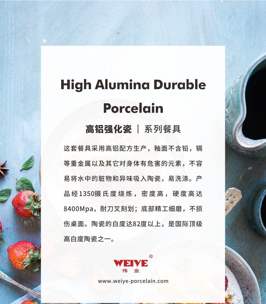 这套餐具采用高铝配方生产,釉面不含铅,镉等重金属以及其它对身体有危害的元素,不容易将水中的脏物和异味吸入陶瓷,易洗涤。产品经1350摄氏度烧炼,密度高,硬度高达8400Mpa,耐刀叉刻划;底部精工细磨,不损伤桌面。陶瓷的白度达82度以上,是国际顶级高白度陶瓷之一。