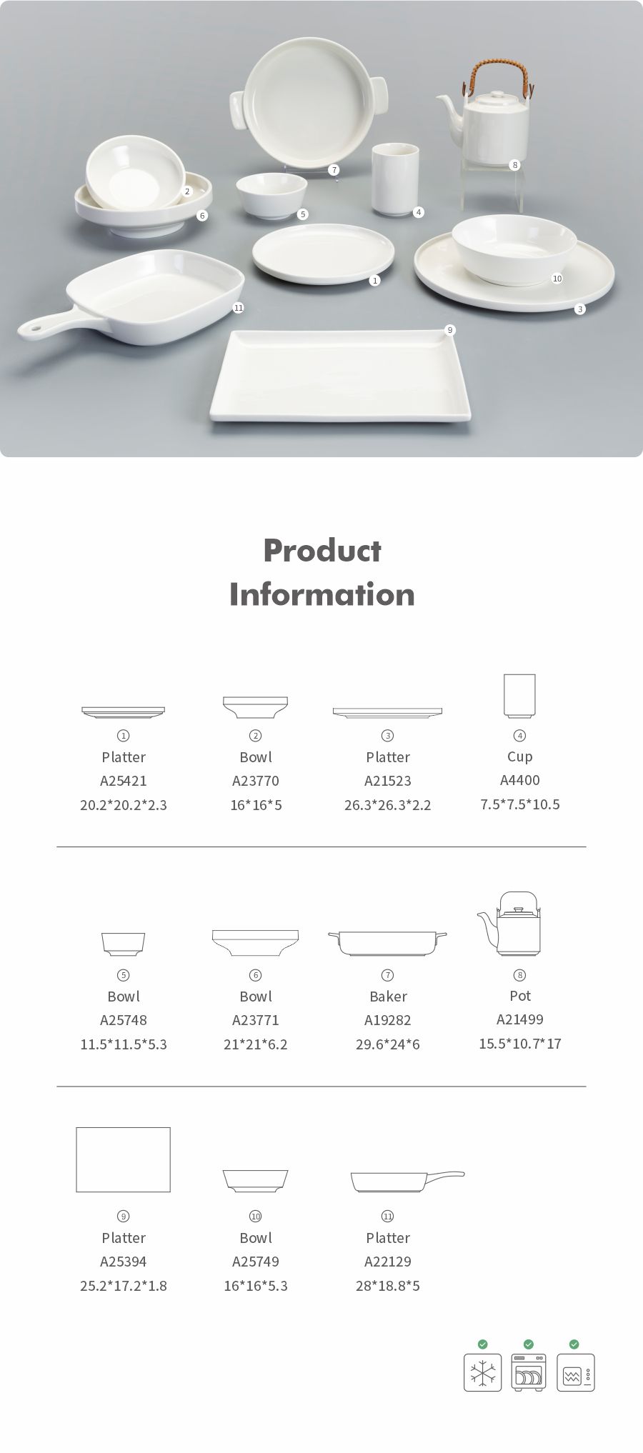 This range of tableware is manufactured from a high-alumina formula, a high quality food-grade, non-toxic, Lead & Cadmium-free material . Low water absorption and Easy-cleaning. The product were fired at 1350 degrees Celsius,which offers reliable strength and durability.The hardness up to 8400Mpa. Scratch resistant and smooth bottom will protect the tables. The whiteness of porcelain is above 82 degrees, which is one of the international top high whiteness porcelain.
