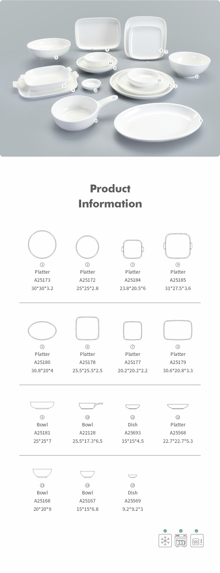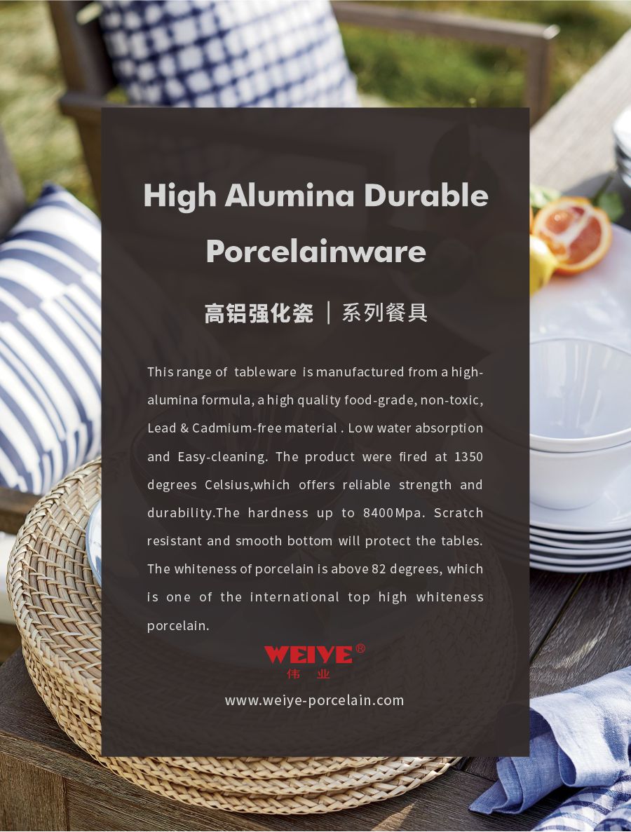 This range of tableware is manufactured from a high-alumina formula, a high quality food-grade, non-toxic, Lead & Cadmium-free material . Low water absorption and Easy-cleaning. The product were fired at 1350 degrees Celsius,which offers reliable strength and durability.The hardness up to 8400Mpa. Scratch resistant and smooth bottom will protect the tables. The whiteness of porcelain is above 82 degrees, which is one of the international top high whiteness porcelain.