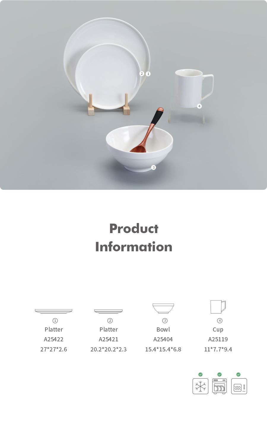 This range of tableware is manufactured from a high-alumina formula, a high quality food-grade, non-toxic, Lead & Cadmium-free material . Low water absorption and Easy-cleaning. The product were fired at 1350 degrees Celsius,which offers reliable strength and durability.The hardness up to 8400Mpa. Scratch resistant and smooth bottom will protect the tables. The whiteness of porcelain is above 82 degrees, which is one of the international top high whiteness porcelain.
