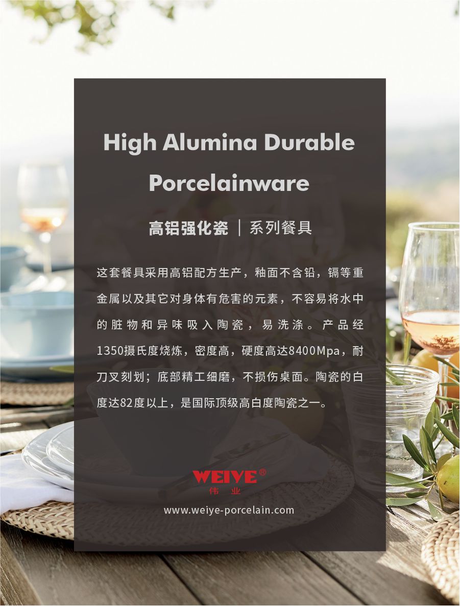 这套餐具采用高铝配方生产,釉面不含铅,镉等重金属以及其它对身体有危害的元素,不容易将水中的脏物和异味吸入陶瓷,易洗涤。产品经1350摄氏度烧炼,密度高,硬度高达8400Mpa,耐刀叉刻划;底部精工细磨,不损伤桌面。陶瓷的白度达82度以上,是国际顶级高白度陶瓷之一。