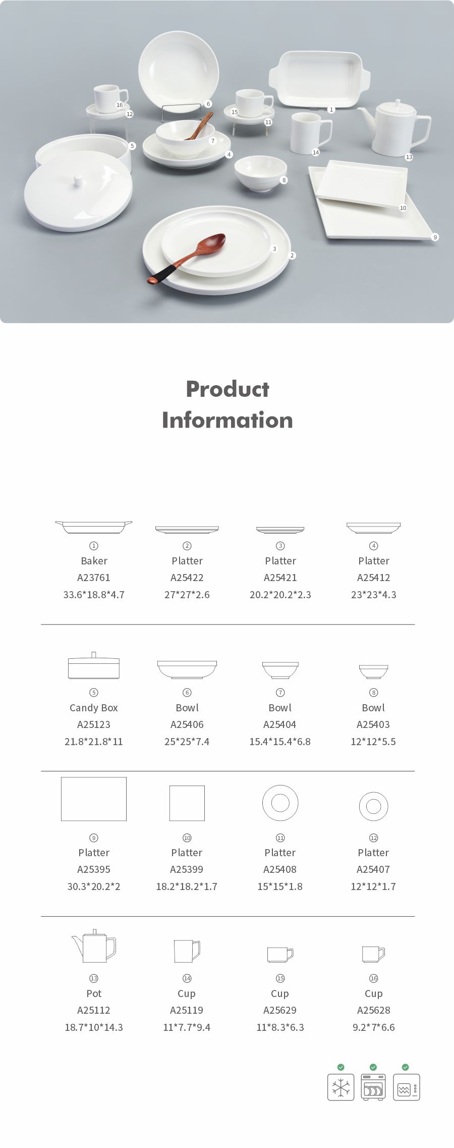 This range of tableware is manufactured from a high-alumina formula, a high quality food-grade, non-toxic, Lead & Cadmium-free material . Low water absorption and Easy-cleaning. The product were fired at 1350 degrees Celsius,which offers reliable strength and durability.The hardness up to 8400Mpa. Scratch resistant and smooth bottom will protect the tables. The whiteness of porcelain is above 82 degrees, which is one of the international top high whiteness porcelain.