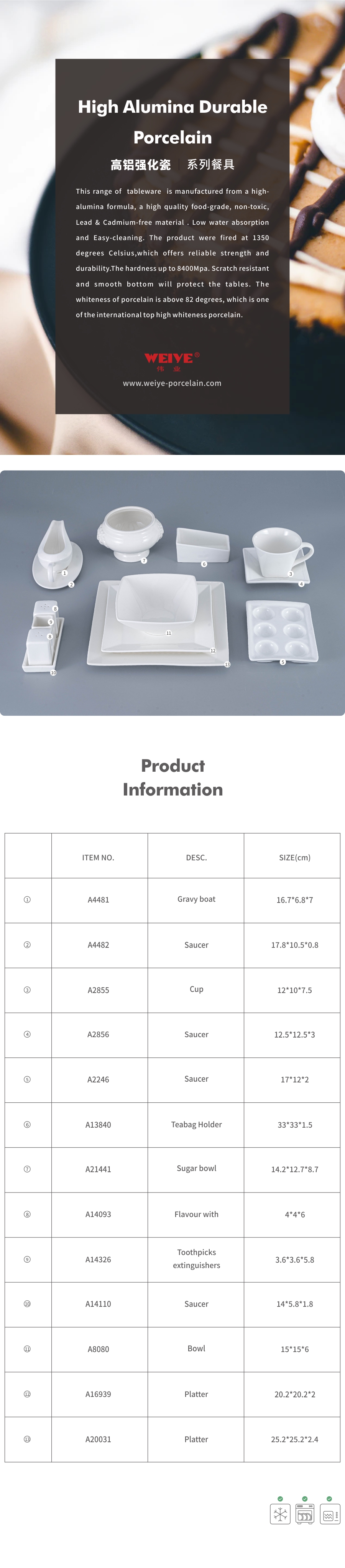 This range of tableware is manufactured from a high-alumina formula, a high quality food-grade, non-toxic, Lead & Cadmium-free material . Low water absorption and Easy-cleaning. The product were fired at 1350 degrees Celsius,which offers reliable strength and durability.The hardness up to 8400Mpa. Scratch resistant and smooth bottom will protect the tables. The whiteness of porcelain is above 82 degrees, which is one of the international top high whiteness porcelain.