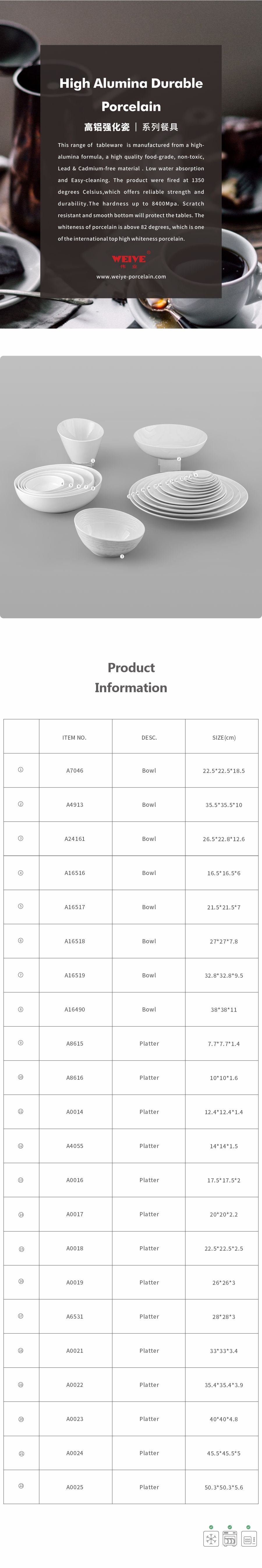 This range of tableware is manufactured from a high-alumina formula, a high quality food-grade, non-toxic, Lead & Cadmium-free material . Low water absorption and Easy-cleaning. The product were fired at 1350 degrees Celsius,which offers reliable strength and durability.The hardness up to 8400Mpa. Scratch resistant and smooth bottom will protect the tables. The whiteness of porcelain is above 82 degrees, which is one of the international top high whiteness porcelain.