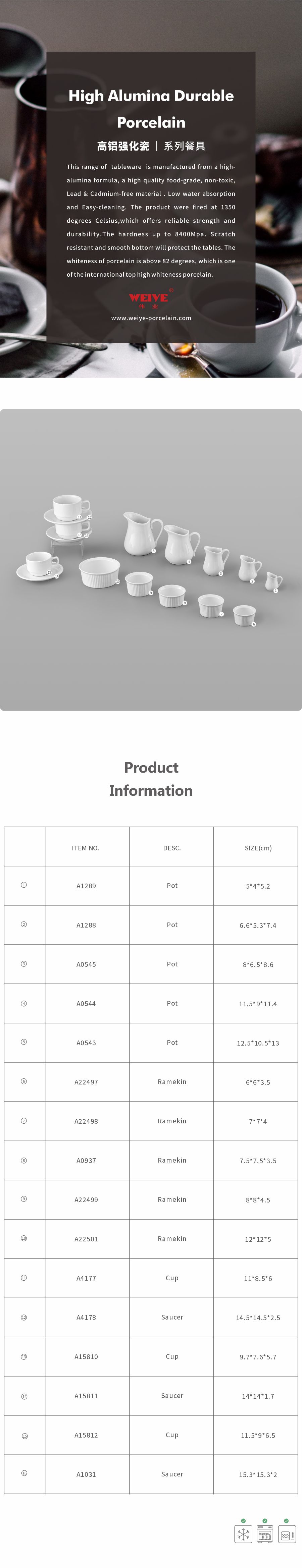 This range of tableware is manufactured from a high-alumina formula, a high quality food-grade, non-toxic, Lead & Cadmium-free material . Low water absorption and Easy-cleaning. The product were fired at 1350 degrees Celsius,which offers reliable strength and durability.The hardness up to 8400Mpa. Scratch resistant and smooth bottom will protect the tables. The whiteness of porcelain is above 82 degrees, which is one of the international top high whiteness porcelain.